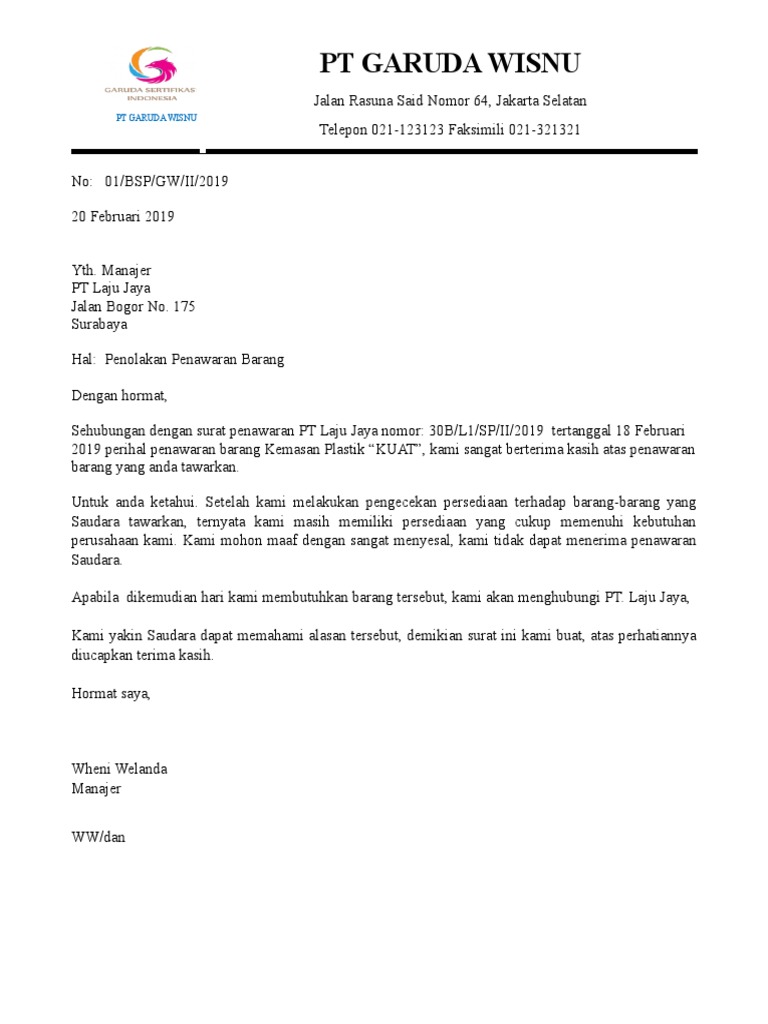 Surat Penolakan Penawaran Ke Pt Laju Jaya Contoh Surat Pdf